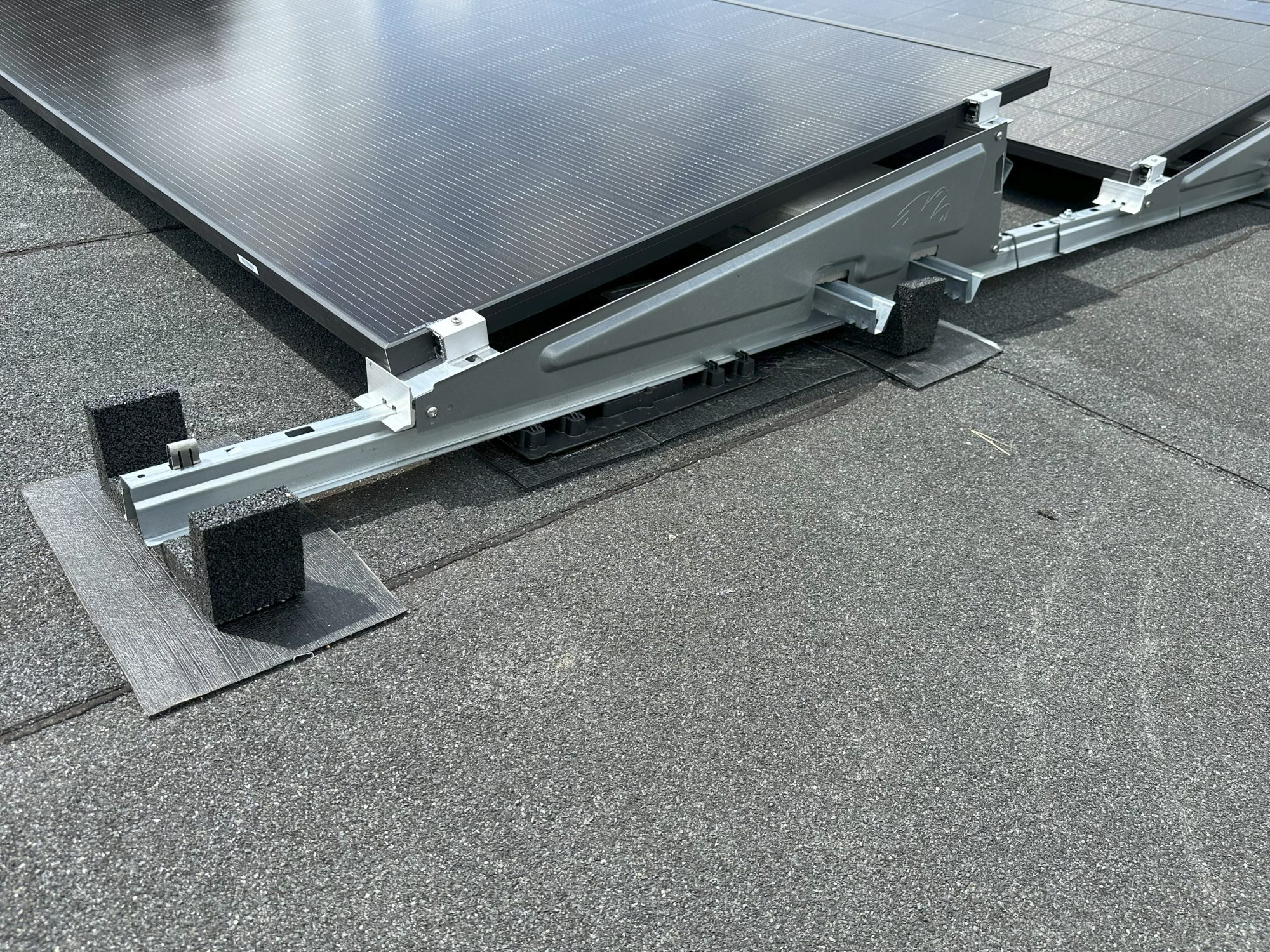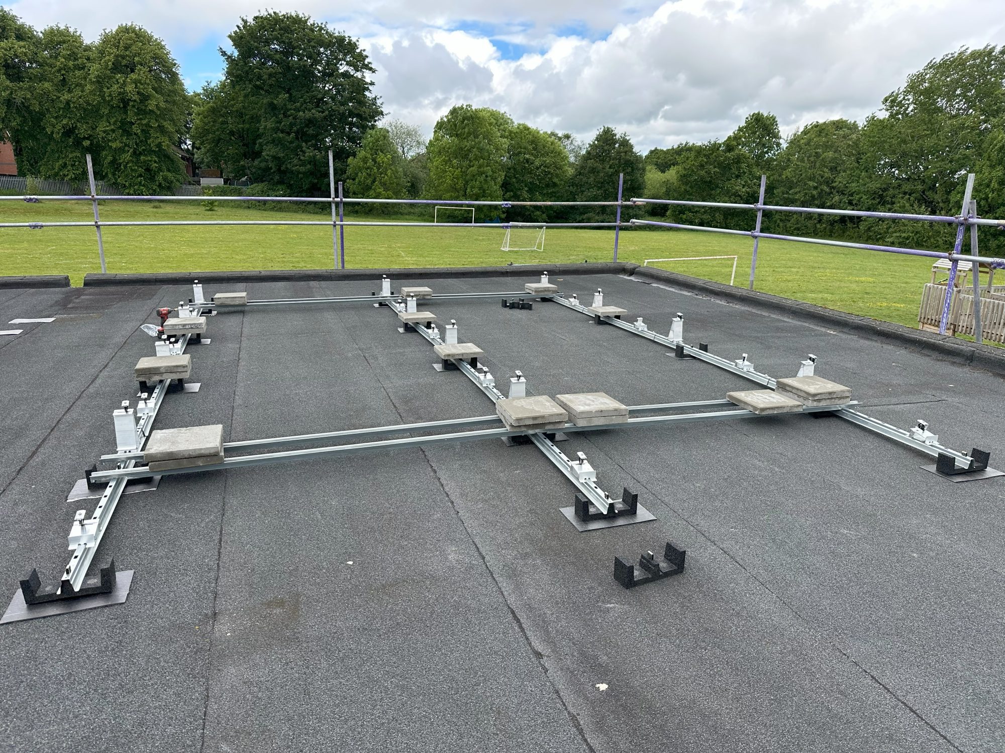 The mounting system starting to take shape with ballast set in place to the manufacturers design.