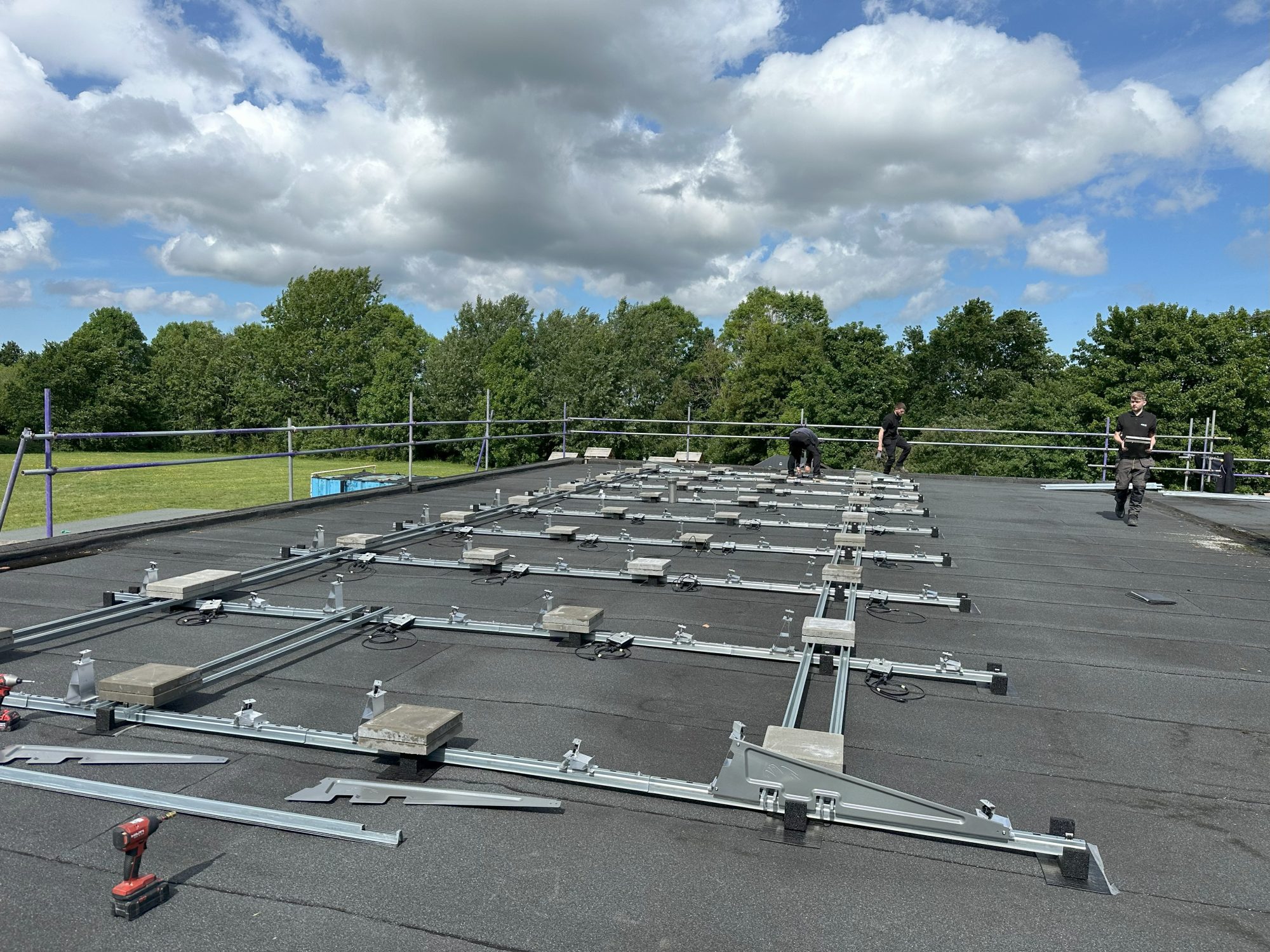 The framework set out with sacrificial pads to provide additional protection to the roof covering, DC cabling, ballast and panels fitted.